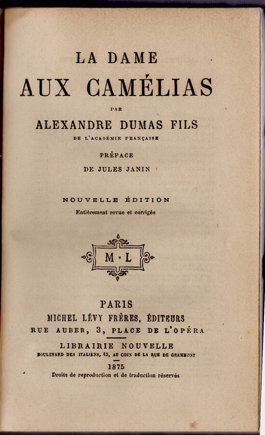 1875 La Dame aux Camélias Alexandre Dumas Fils Paris MICHEL LEVY Lagny F.AUREAU