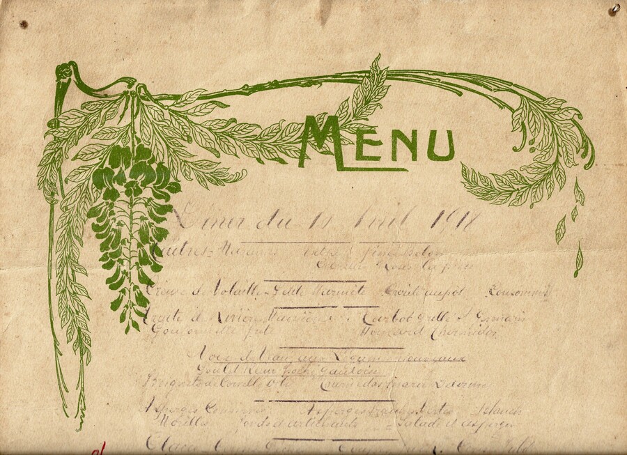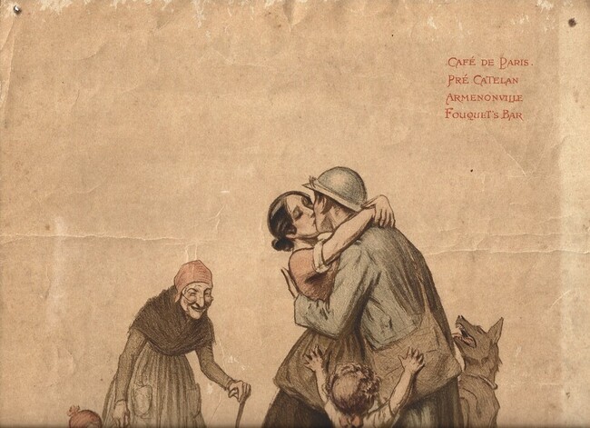 Ancien très grand et rare menu papier cartonné, au format 30 X 40 cm, recto-verso. Illustration de G.REDON (Note 1) représentant un soldat de retour de guerre embrassant sa compagne, avec enfants, grand mère et chien. Menu servant aux restaurants "CAFÉ DE PARIS, ARMENONVILLE, PRÉ CATALAN, FOUQUET'S BAR". Menu du10 avril 1918, style Art Nouveau, portant la restriction de consommation suivant le décret du 12 février 1918. Menu sorti des ateliers de Georges REDON 53 rue Nollet à Paris, imprimerie MONROCQ et Cie 3 rue Suger à Paris. Note 1: Georges REDON (Paris1869-1943) , chevalier de la Légion d'Honneur, artiste français qui se distingue dans l'Art Nouveau. Etat voir scan. Envoi rapide, sécurisé et soigné à domicile en Colissimo. Frais de port offerts pour la France. Réf: 8659.S.211. Prix: 100 €.