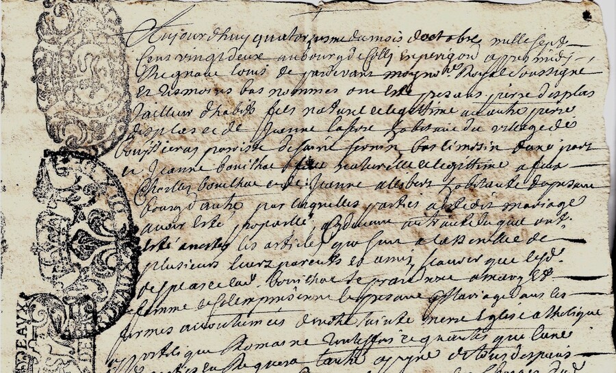 Ancien document manuscrit, deux pages, daté 1722, avec tampons de la Généralité de Bordeaux. Contrat de mariage passé à Colli (Coly en Dordogne) entre Pierre DESPLAS tailleur d'habits fils de Pierre DESPLAS et de Jeanne LASEVRE habitant du village des Boussièras paroisse de Saint-Sernin en Bas Limousin (?); et Jeanne BOUILHAC fille des défunts Charles BOUILHAC et Jeanne ALLIBERT habitant de Coly. A exploiter. Archives familiales. Bon état voir scan. Envoi sécurisé rapide à domicile, dans ses plis, en lettre suivie. Réf: 9072.S.231. Offert aux AD Dordogne.